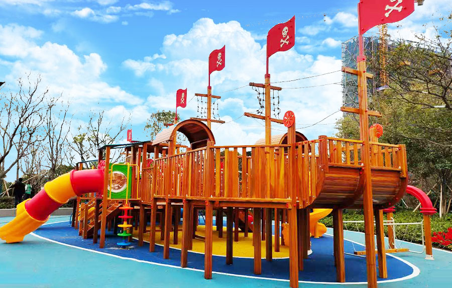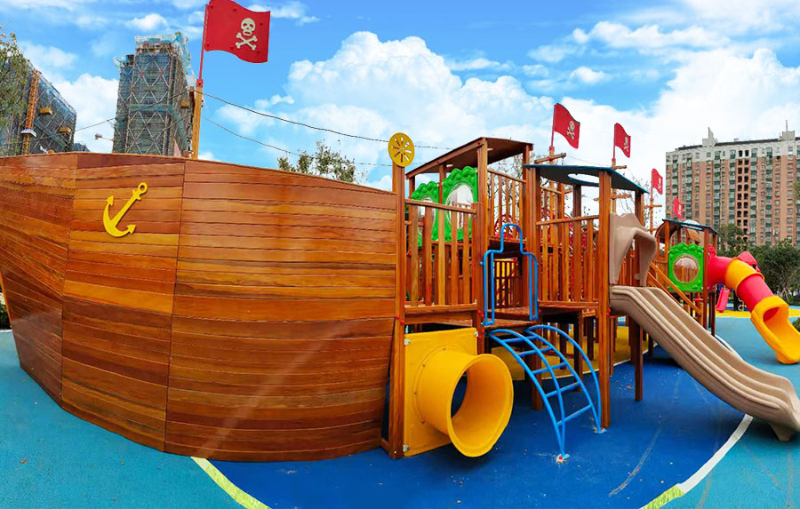 非标木制滑梯组合案例采用海盗船的设计主体为原型设计,增加了大型滑梯组合以及攀爬、钻洞等功能,整个主体设备采用木制结构,乐发lv游乐生产的木制游乐设备具有颜色艳丽、外观漂亮,实用性强、经久耐用、安全性能好等特点,为小朋友的玩耍提供了一个很好的场所。
