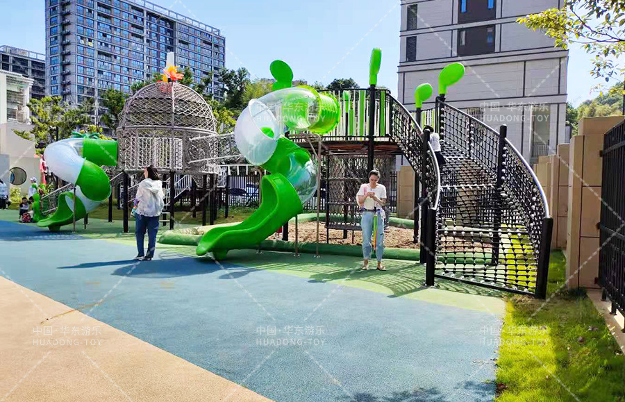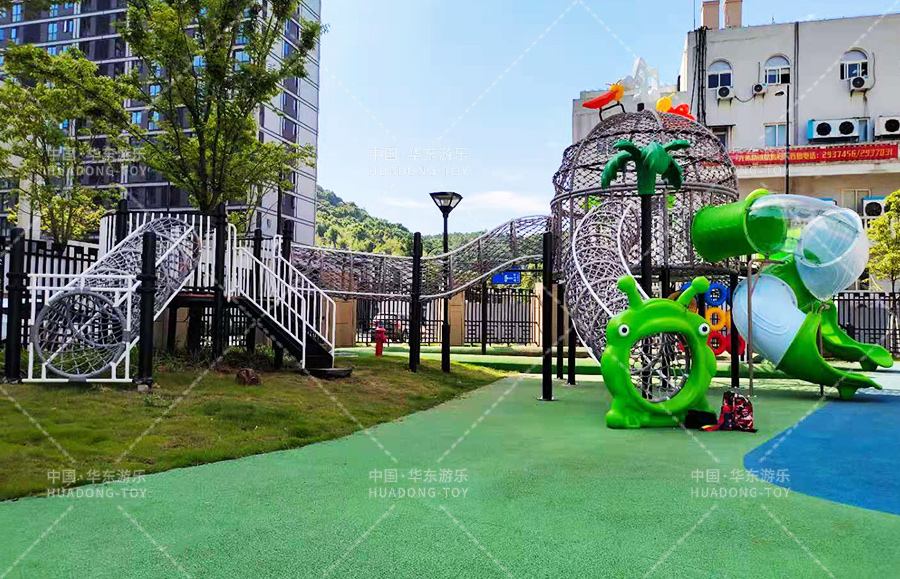 舟山市畚斗岙幼儿园此次选用的是又乐发lv游乐自主研发和设计的网绳系列户外滑梯组合,具备了爬网、钻洞、滑梯、滑桶、吊环、攀爬梯、沙池等游乐设备,能够让小朋友在玩耍中得到很好的锻炼和学习。