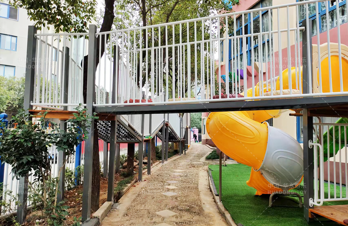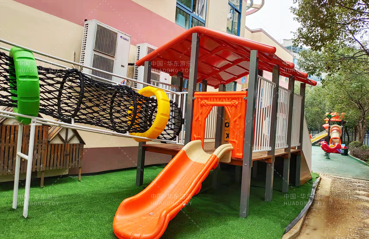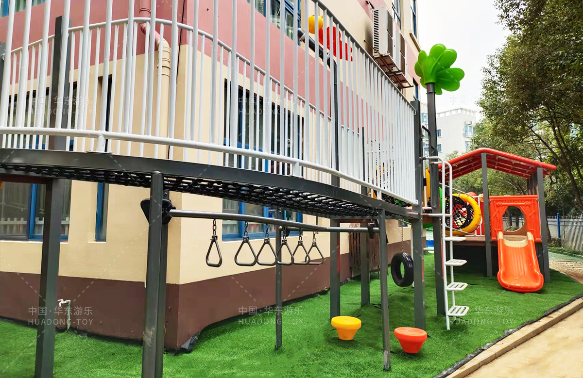 绿都幼儿园选用的是乐发lv游乐自主研发的具有攀爬、滑梯、爬网、钻洞、葫芦攀爬为一体的综合性游乐设备。