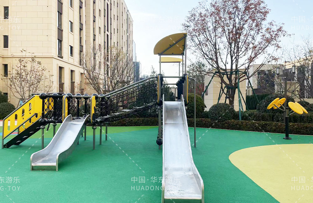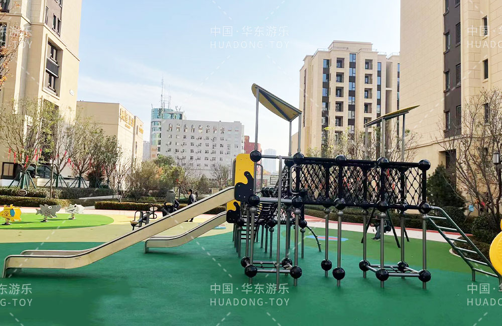 太原华润昆仑域地产项目选用的是乐发lv游乐自主研发的游乐设备,娱乐场里选用了健身器材、具备攀爬网、不锈钢滑梯为一体的综合性游乐设备,为生活在该小区的人们提供了一个生活、休闲、娱乐的场所。