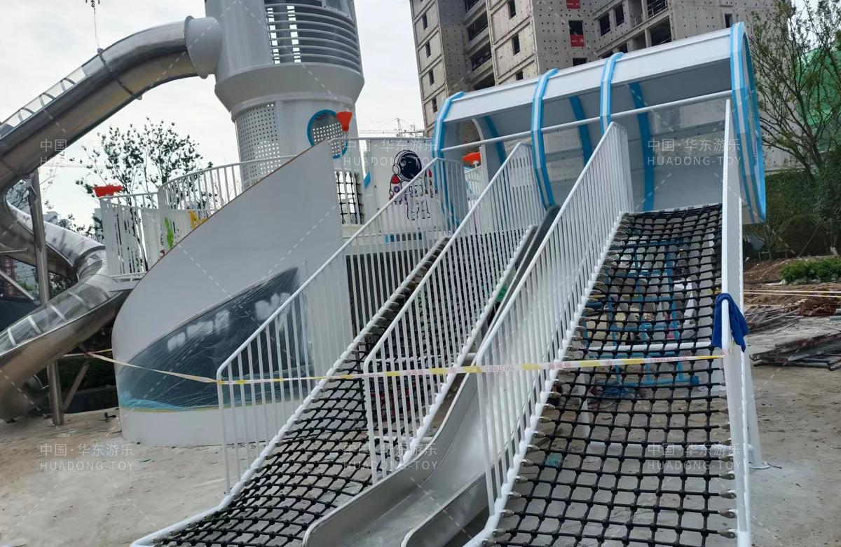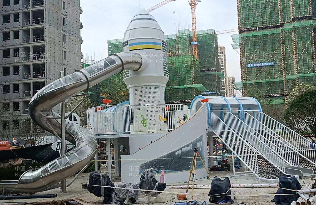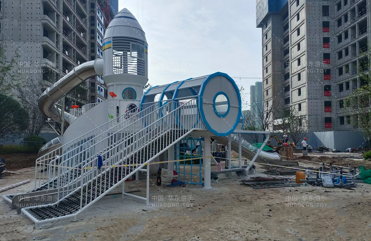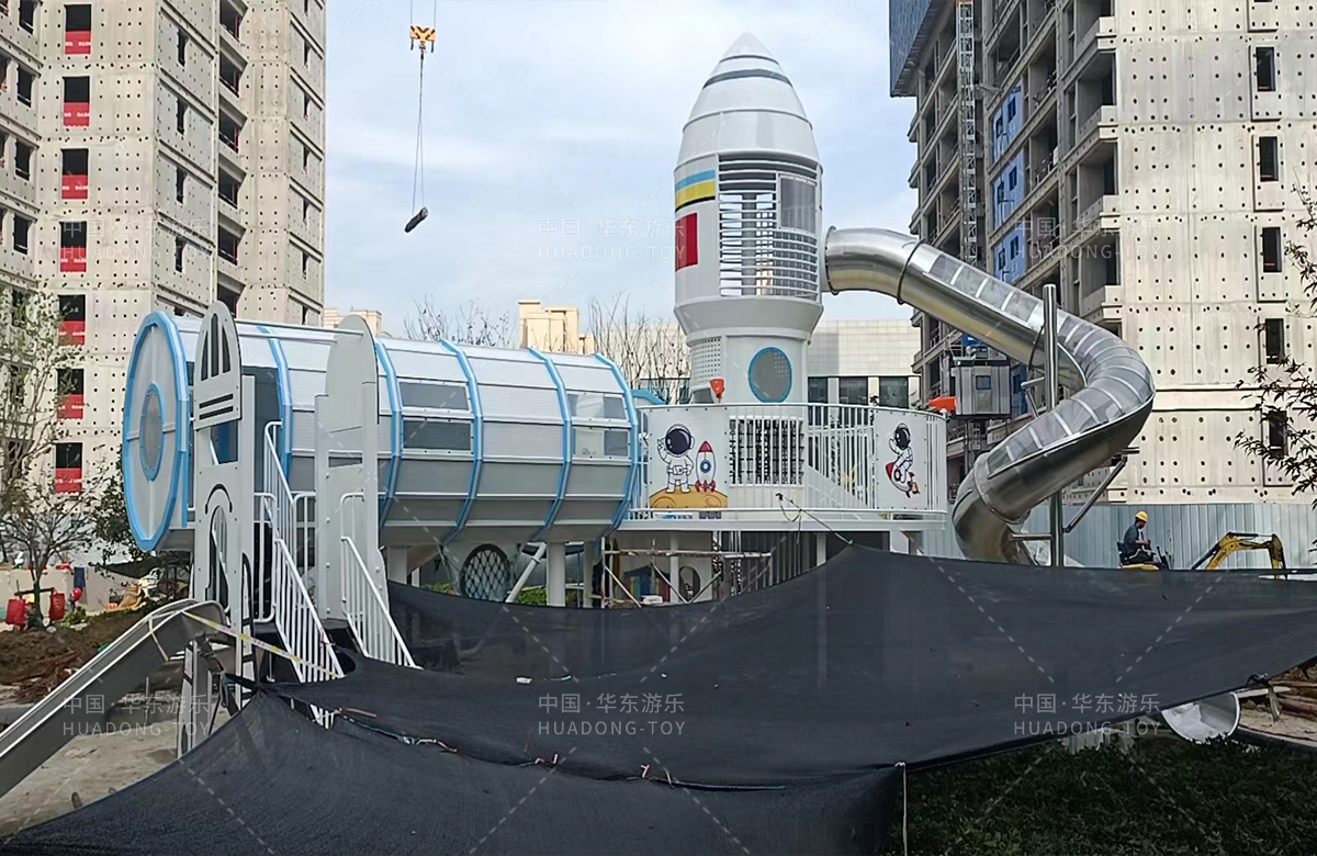 安徽省亳州市涡阳县荣徽上河郡选用的是乐发lv游乐自主研发和生产的以航天飞机为主题的大型非标定制的游乐设备,是一款具备了攀爬网、攀爬梯、旋转滑筒、儿童摇摇乐为一体的综合性儿童游乐场。